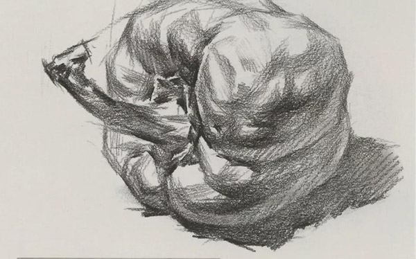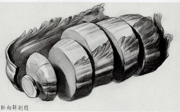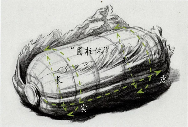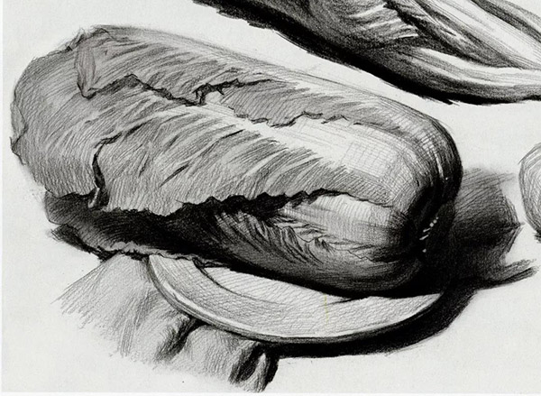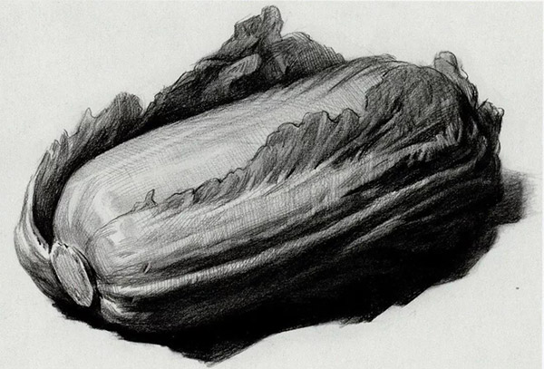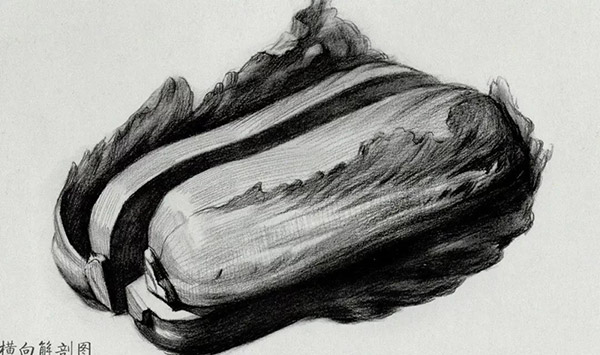 大白菜是生活中和素描中最为常见的蔬菜之一,想画好大白菜首先要对圆柱体有一个全面的认知,大白菜形体类似于圆柱体,表面有叠加的菜叶,形状不规则。当我们在塑造体积时要考虑到静物所处的空间关系和产生的透视变化,如下图中的大白菜,注意前后圆面的变化,近大远小。