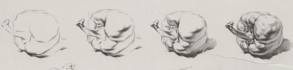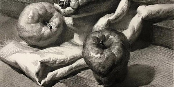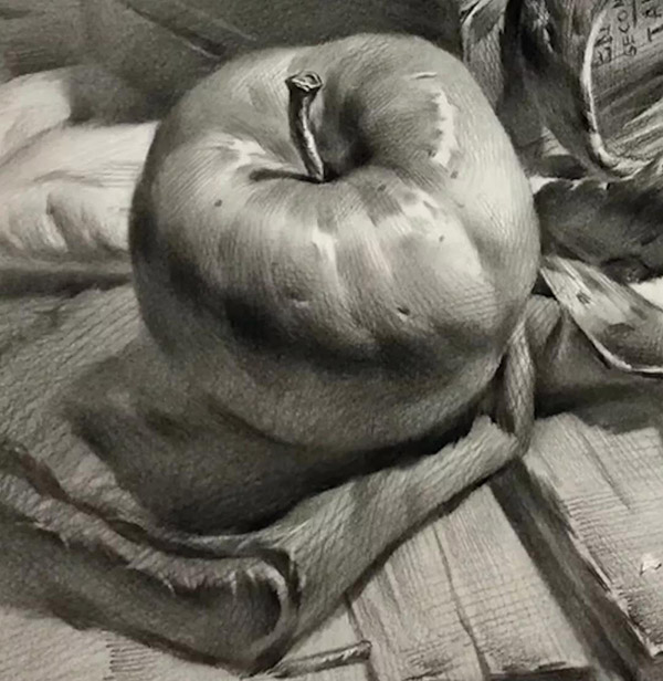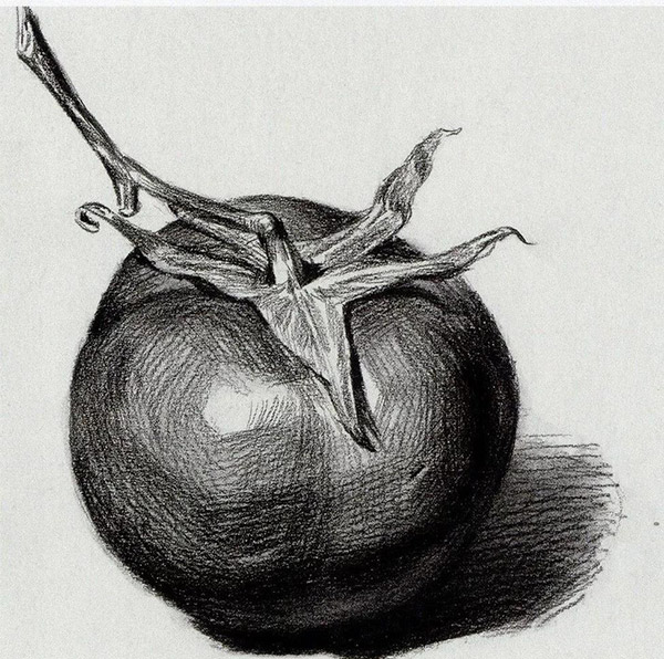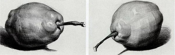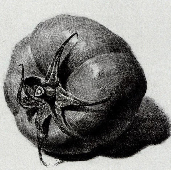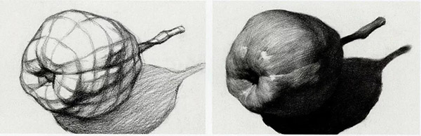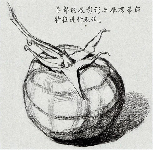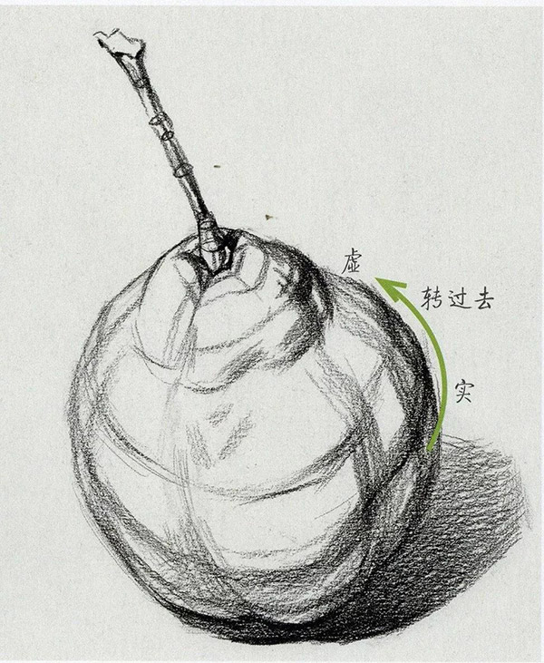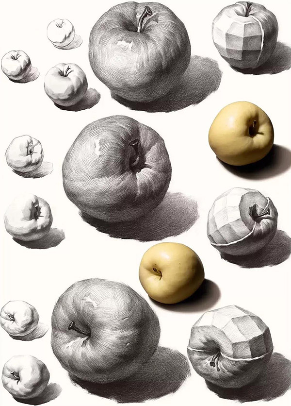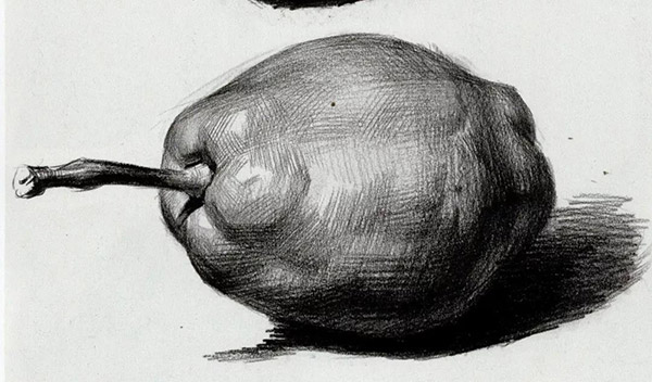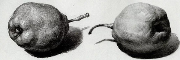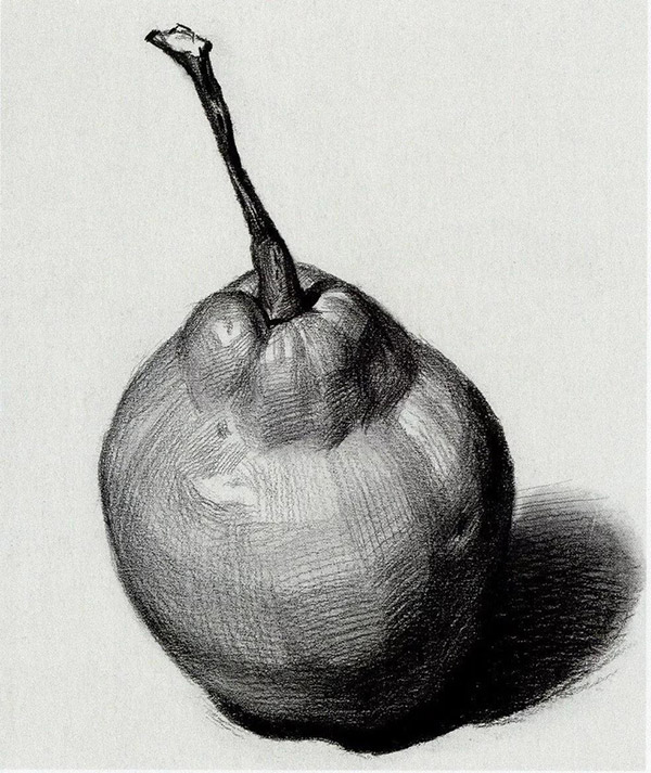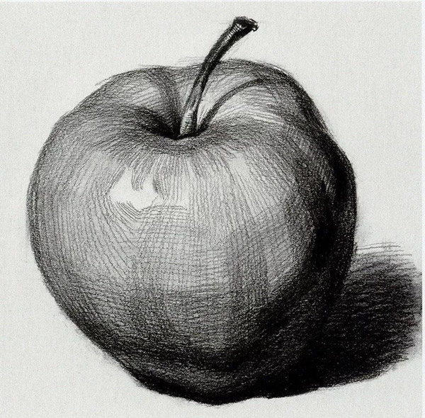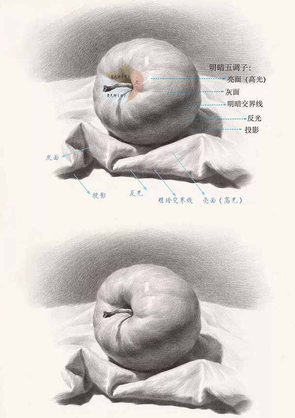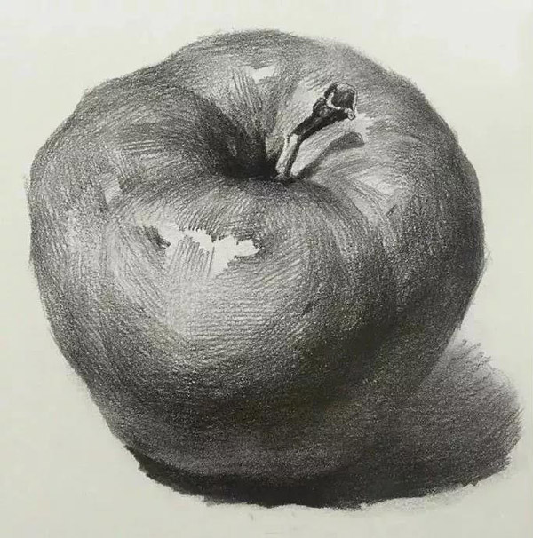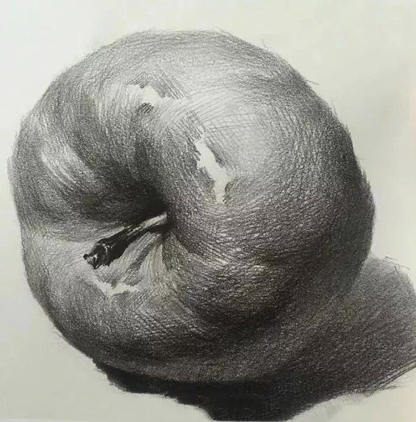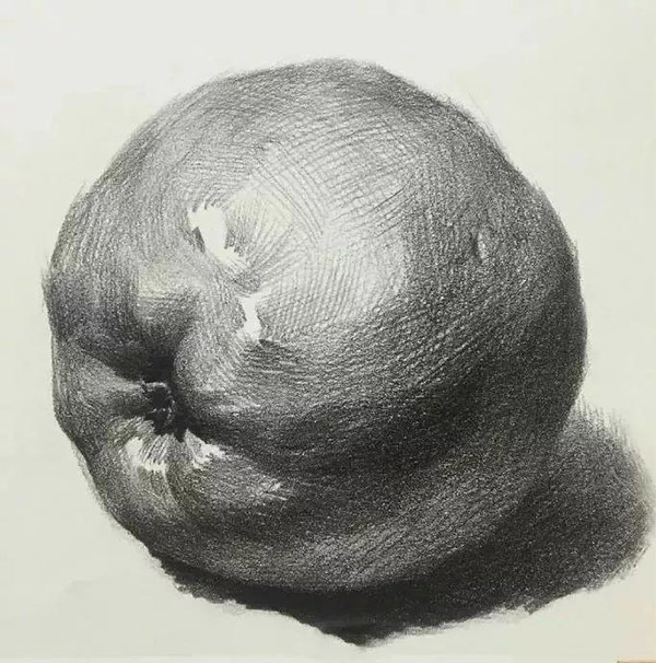 蒂窝向上:苹果“窝”的黑白灰关系明确,明暗交界线靠近苹果的外轮廓线。