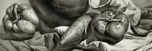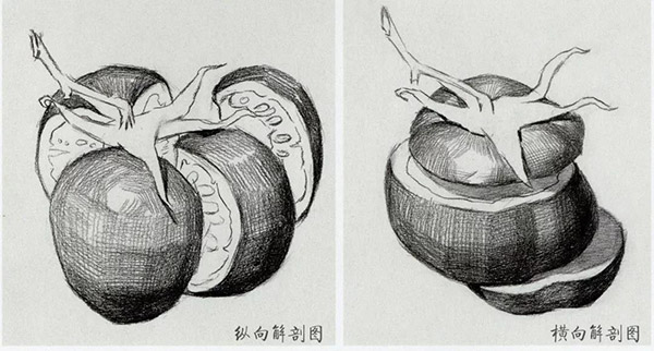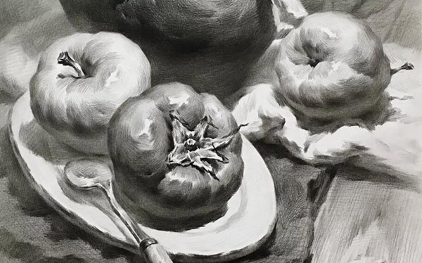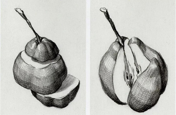 像橘子、山竹、西红柿这些水果蔬菜和苹果都有类似的地方,那么通过画好苹果在一定程度上也可以把它们画好。而梨子的不同的点在于梨子与苹果的内部结构有一定的区别,水果的刻画一定是通过一个个有变化的面去表现,水果画得好不好就要看结构和明暗交界线找得好不好。