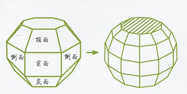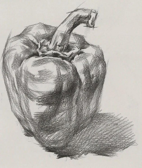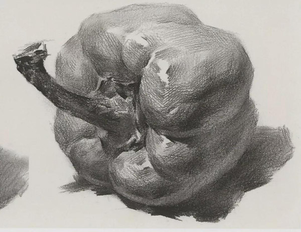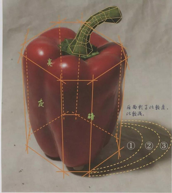 青椒的“身体”看上去是一瓣一瓣的,这些小的细节特征会影响到我们对其大是形体特征的判断。把青椒先当做一个方体来理解,你就能把干扰你的那些小形体归纳到不同面里去塑造了,这符合“小面服从大面”的理论。