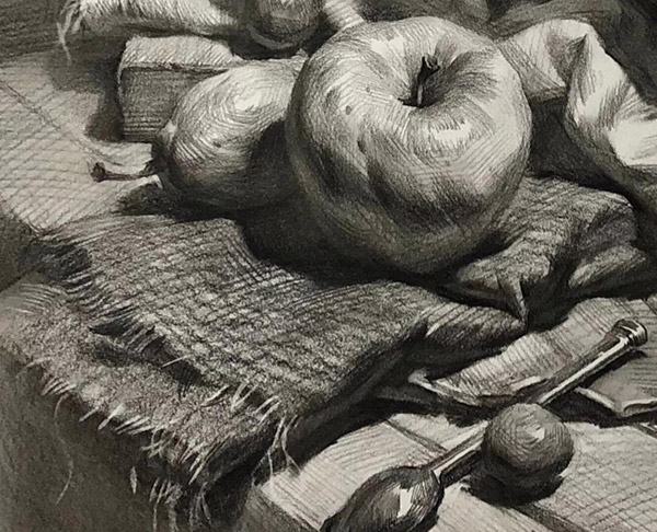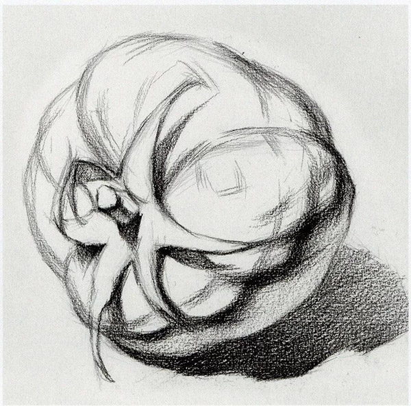 梨是球体和三角锥体相加所产生的形状,它的造型与朝向是画面生动性的重要体现。梨固有色的表达要与整体结构、体积相协调,蒂把等局部细节也要注意整体感。此外,边缘线要有强弱、虚实变化,使其体积感更强烈。梨子的下半部分是比较圆的,但是也并不是圆到没有体块变化,所以我们还是要把体块关系牢牢的把握住,“宁方勿圆”是素描静物中不变的真理。