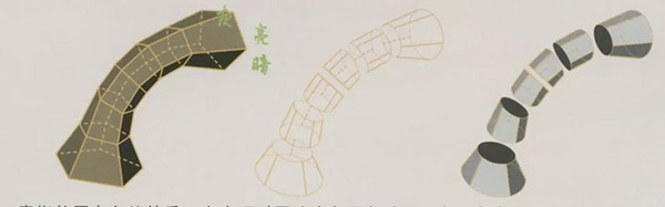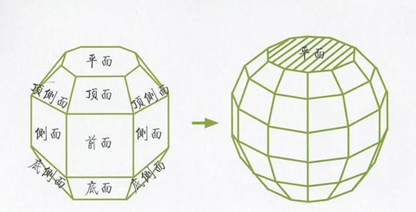 青椒柄的形状像一根圆柱在插在上面,在塑造时把它当柱体来对待,先分出三大面,然后再每个面的基础上画出一些小的形体变化,这样画出来既有体积又有细节。