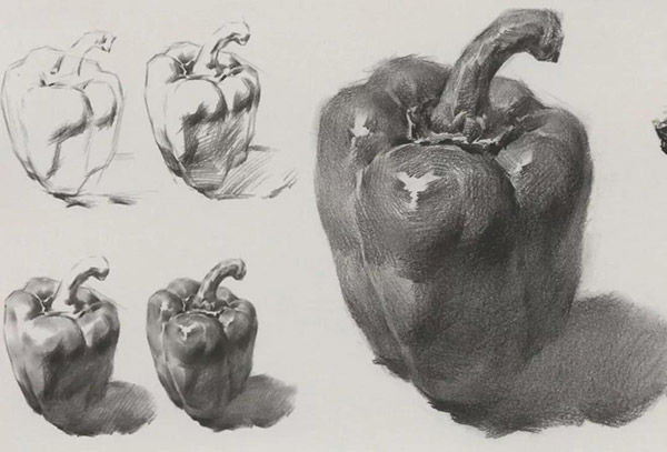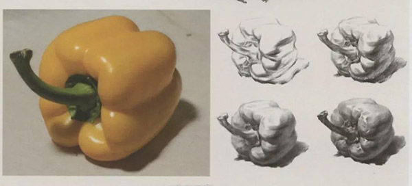 青椒的固有色较重,在表现时要注意灰面与暗面、灰面与灰面、灰面与亮面之间颜色的对比度,其之间的颜色色距落差小,变化微妙。
