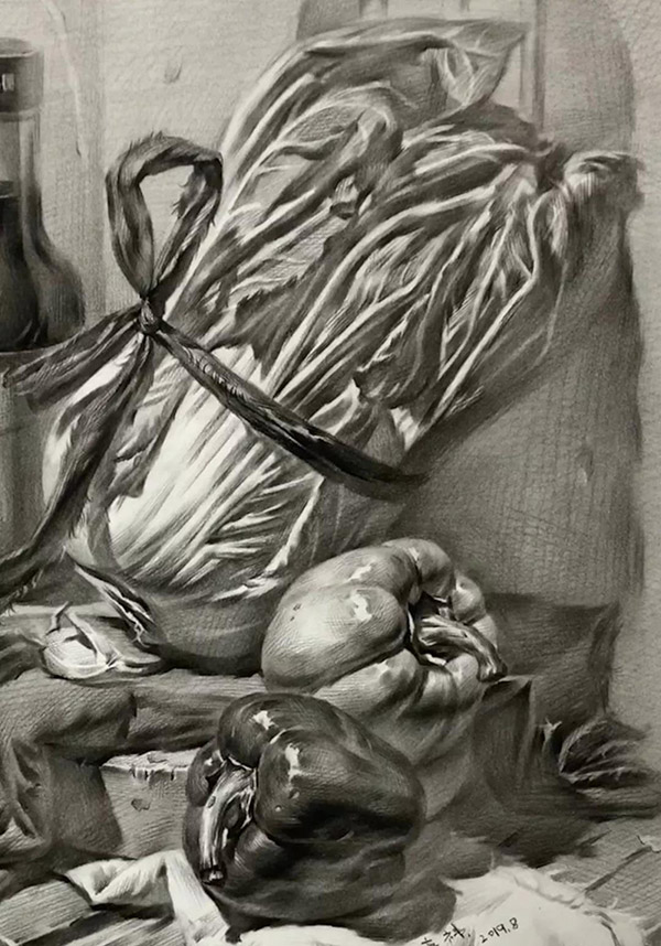 关于质感的塑造,注意白菜叶与白菜帮两者的对比与区别,白菜帮质感光滑、纹理整洁清晰,固有色较浅,白菜叶纹理较深。作画时我们要考虑到白菜叶是依附在整个白菜体积和空间上的,在不破坏整体关系的基础上进行刻画,且白菜帮与白菜叶之间的衔接要整体、自然。