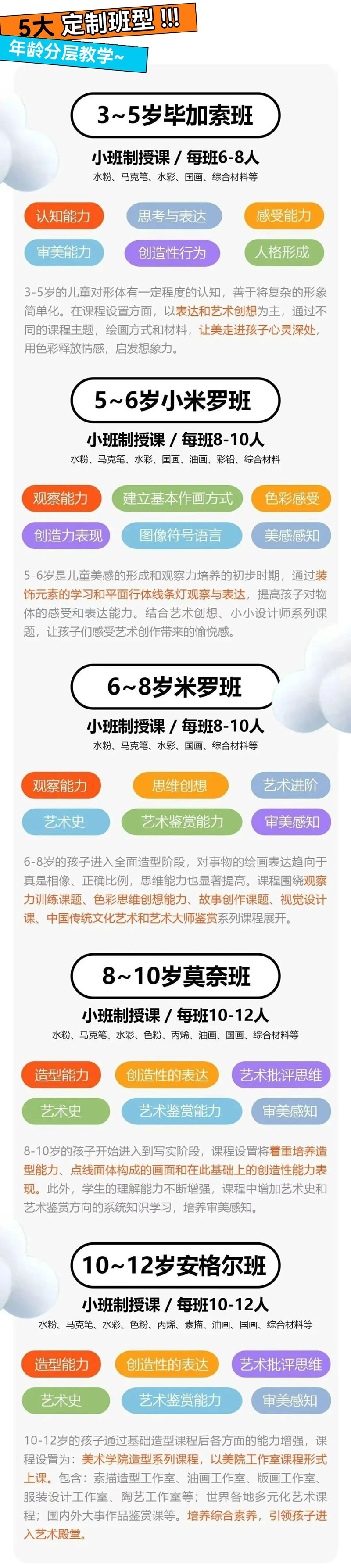 核心师资均毕业于中央美术学院、清华大学美术学院中国美术学院等中国九大美院。根据年龄段不同分层教学,致力于国家美育发展,培养具有审美意识、独立思考善于表达和创新的综合素质人才。