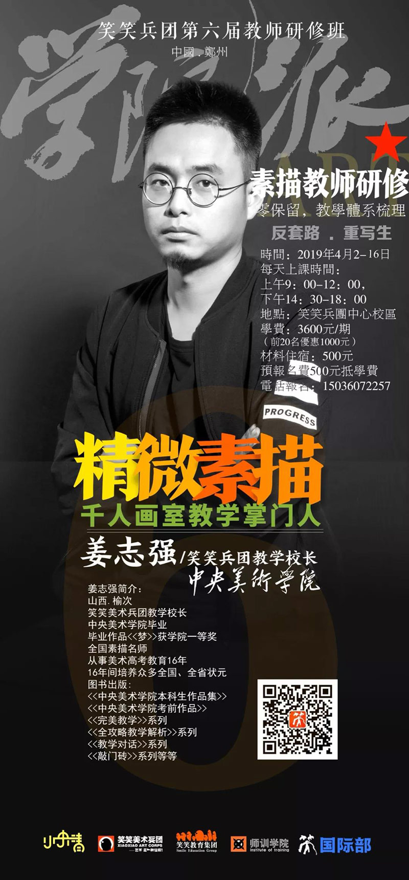 河南省第四届美术教师研修班将于2019年4月15日拉开序幕,由笑笑兵团教学校长亲自授课,开设素描、色彩、速写三大课程,授课地点位于笑笑美术兵团中心校区(郑州市双铺路园田路口往东300米路南·笑笑艺术),欢迎全国高中、初中、小学美术教师及美术机构教师前来交流,一起教研学习,想要提升自己的老师们可以扫上方二维码报名啦,免费提升自己的好机会,还不赶紧抓住!