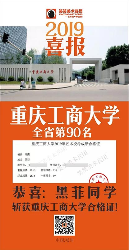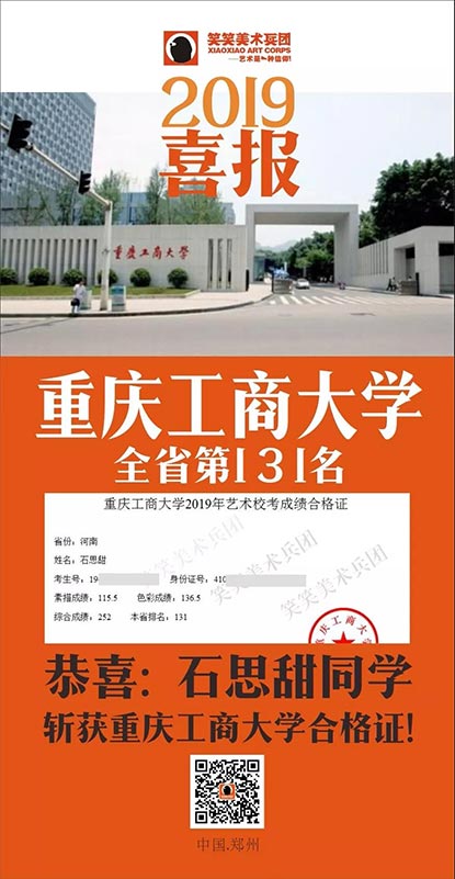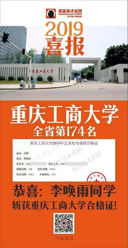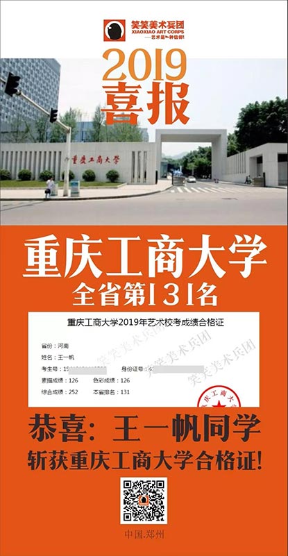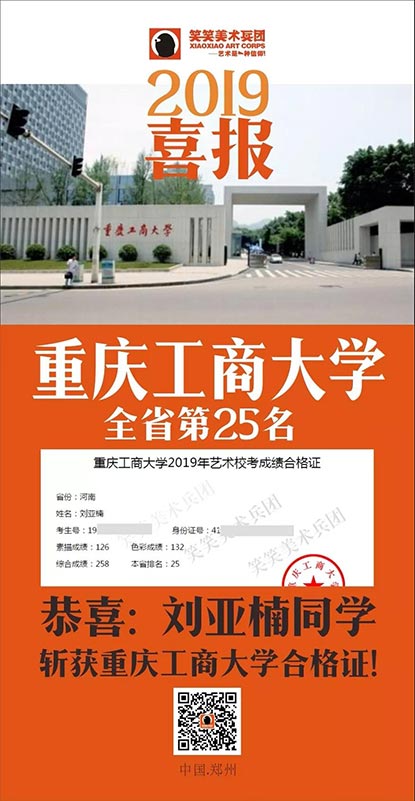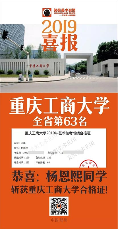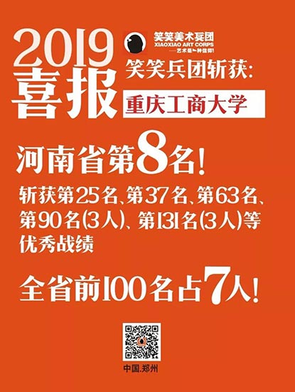 截至目前,笑笑美术兵团已斩获重庆工商大学河南省第8名、第25名、第37名、第63名、第90名(3人)、第131名(3人)、第174名等优秀战绩!全省前100名占7人!