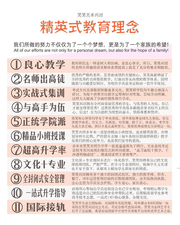 河南省笑笑美术学校,创办于2003年,至今已有16年的办学历史。是正规注册的美术高考(专业➕文化课)、预科、艺术留学为一体的封闭式、私立国际美术培训学校。