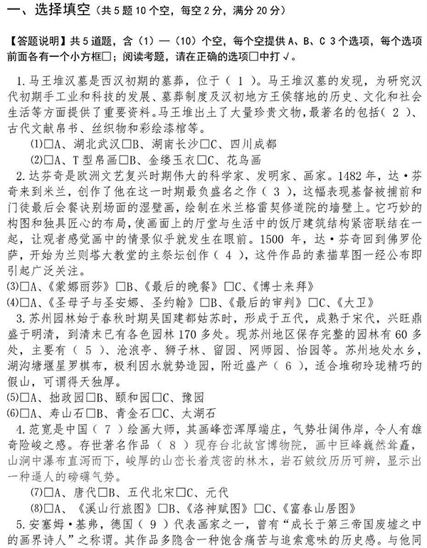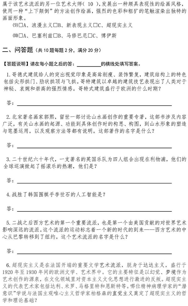 考试内容:一、从你曾经参观过的三个展览(包括但不限于美术展览,尽可能说出展览的名称、展出地点和时间)中各选取一件令你印象深刻的作品进行描述,并阐明它令你留下印象的理由。(30分)