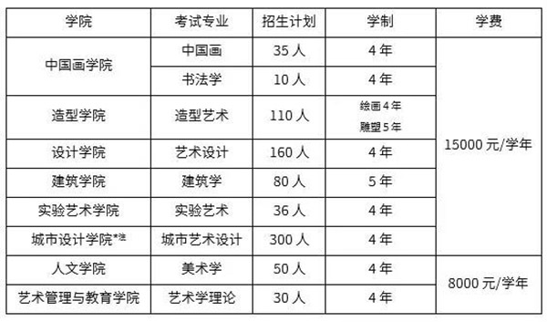 现有20个本科专业,包括中国画、书法学、绘画、雕塑、实验艺术、视觉传达设计、工业设计、产品设计、 数字媒体艺术、服装与服饰设计、摄影、美术学、艺术史论、文化产业管理、建筑学、风景园林设计、影视摄影与制作、 环境设计、公共艺术、动画。