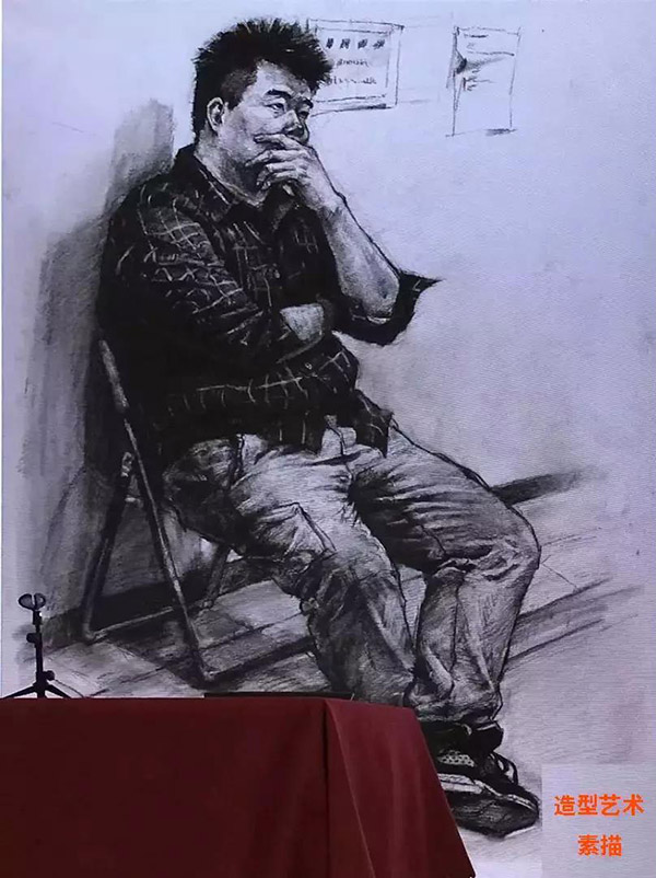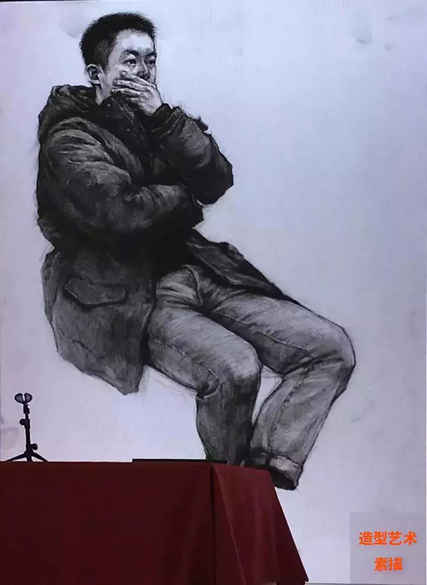 考试内容:男青年,模特左手捂嘴,右手藏于左臂肘后,下肢回收交叉。