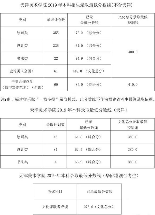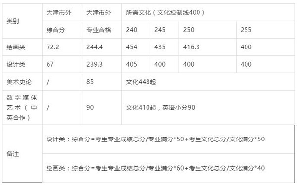 天津美术学院2019年不分省本科专业录取分数线