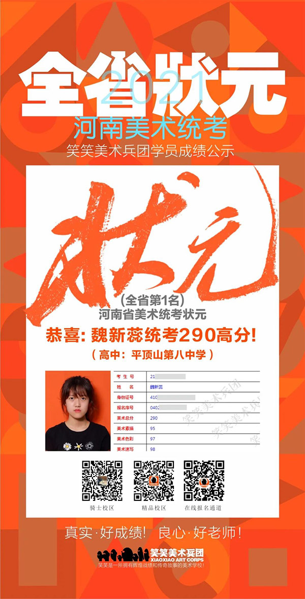恭喜笑笑小兵魏新蕊斩获河南美术统考290分(全省状元)