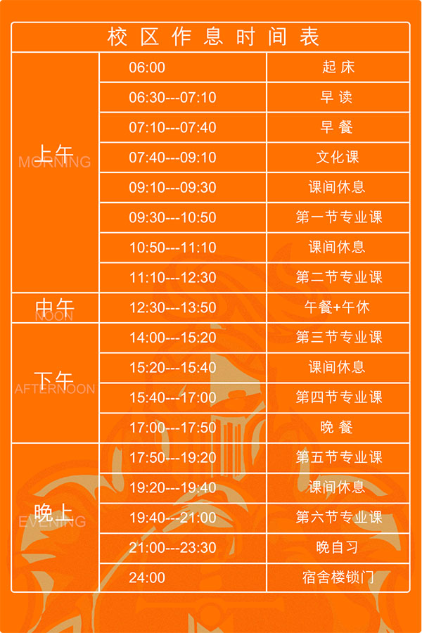 (注:以实际上课时间安排为准,每天安排三课时文化课,不同的班级上午/下午/晚上在不同的时间段上课。)