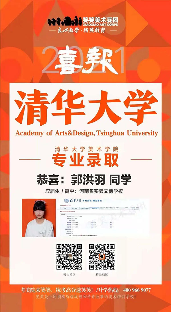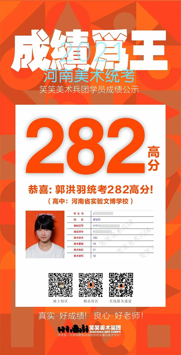 郭洪羽这个可爱的郑州女孩,在2021届河南联考中,在6万多的联考大军中获得了282分的高分成绩,同时拿到了清华大学的专业录取合格证,这个专注的女孩用行动诠释了她自己的美术梦。