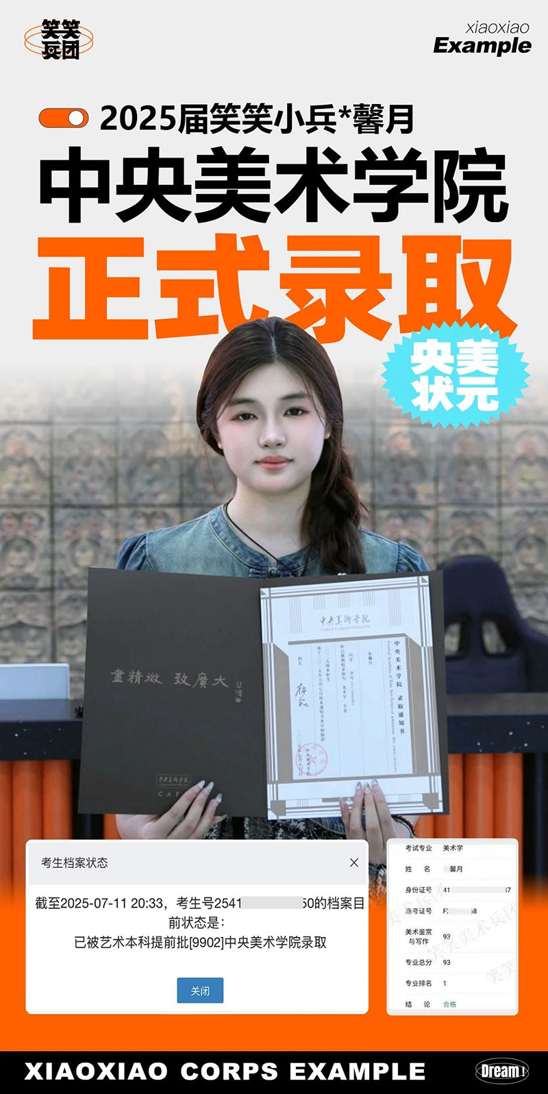 在竞争激烈的高考中,笑笑小兵*馨月同学能斩获第1名的成绩成功录取中央美术学院,绝非偶然。一定有着独特且行之有效的学习经验与方法,值得广大怀揣央美梦的学子借鉴。那么今天,就让我们一起来看看央美第一的学习秘籍吧~
