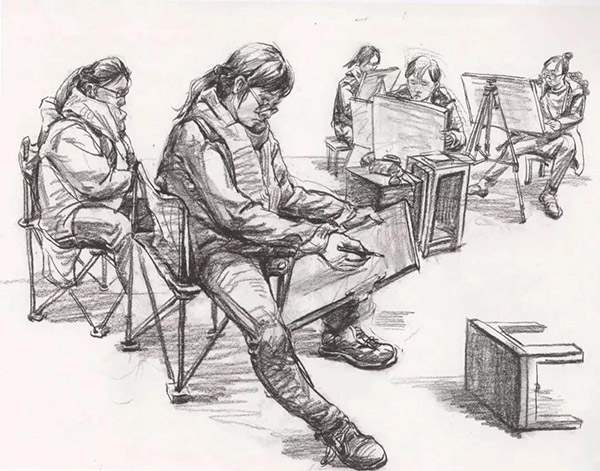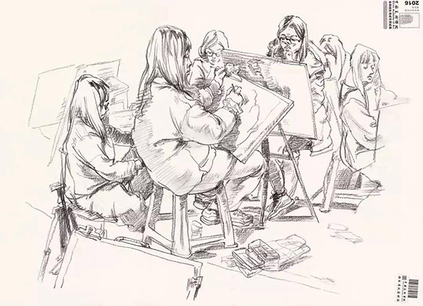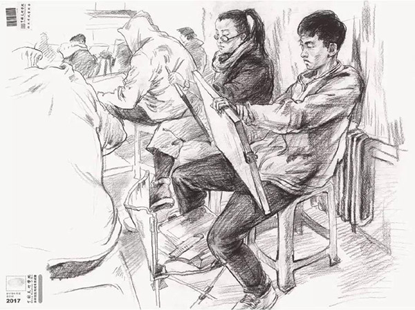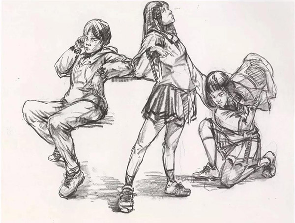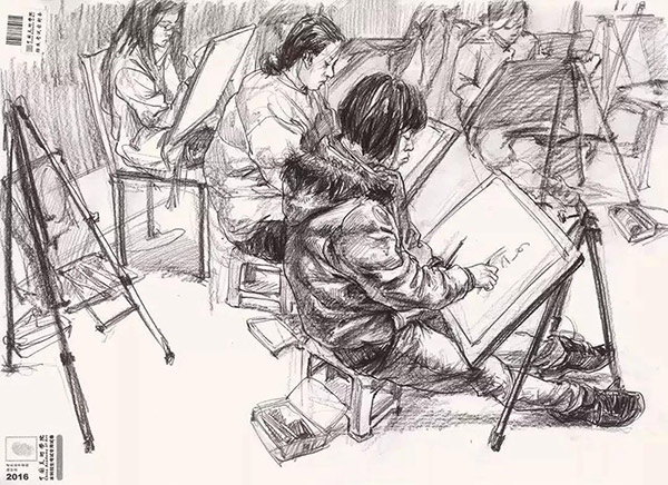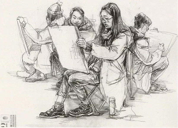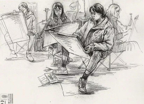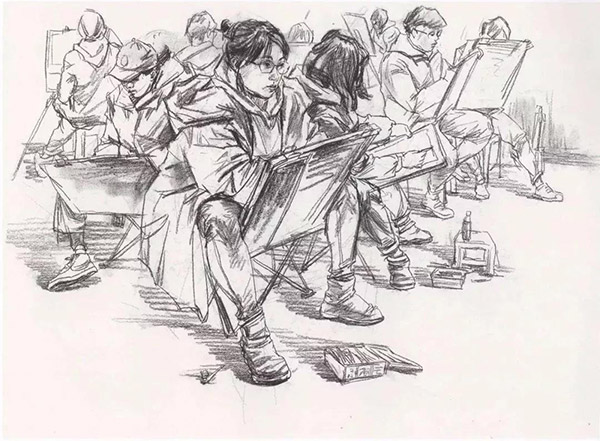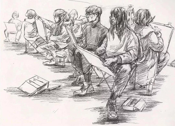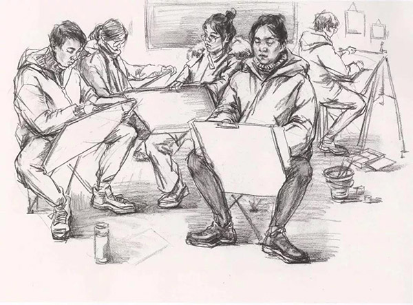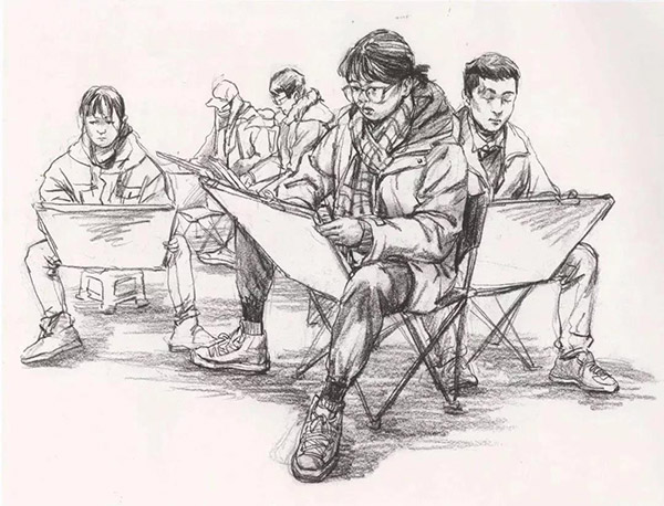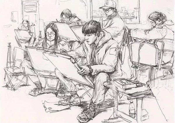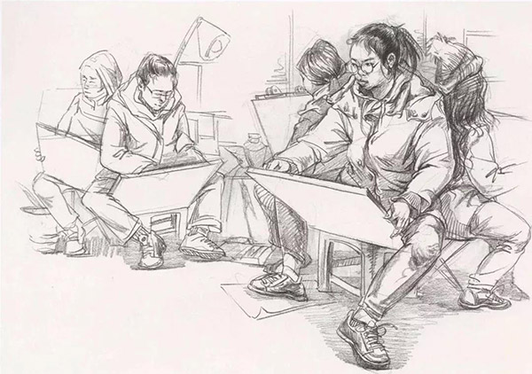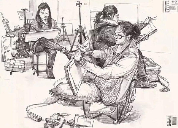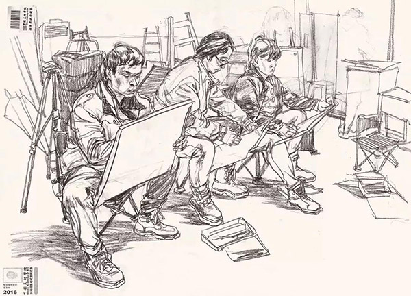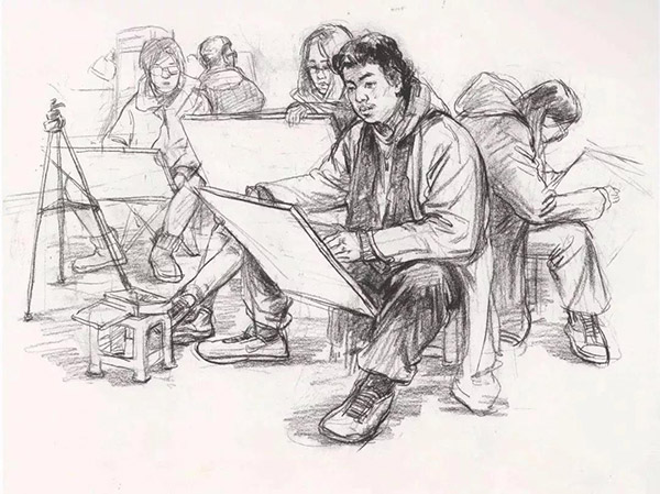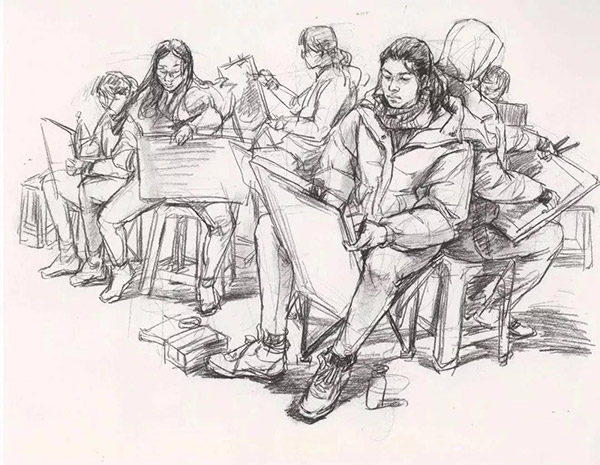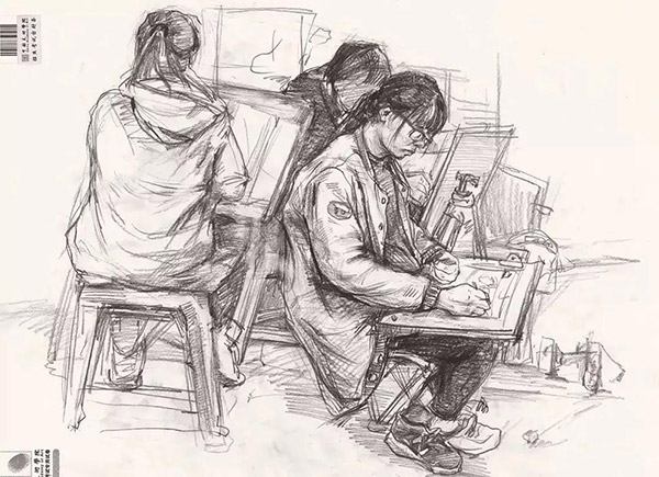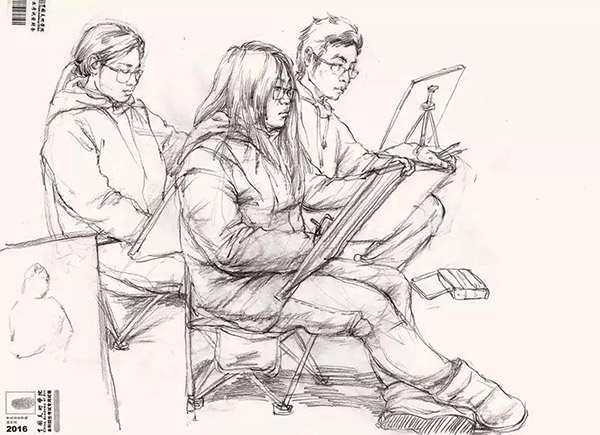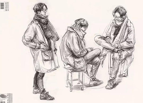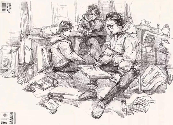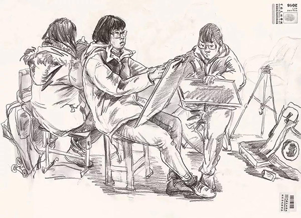速写考题:考生互画三人场景,由三个人物组成,一个造型完整,另外两个自行安排