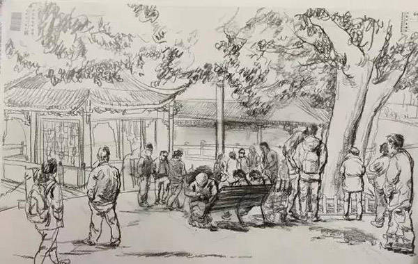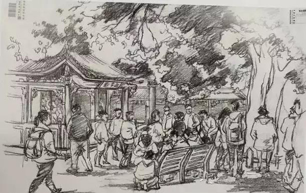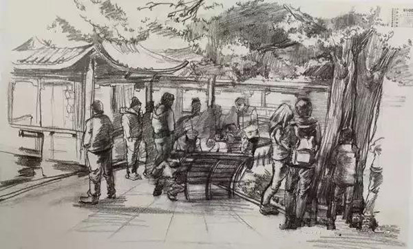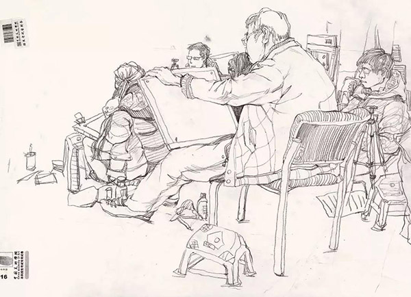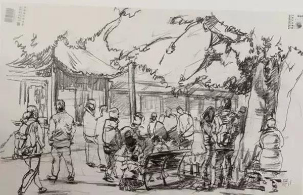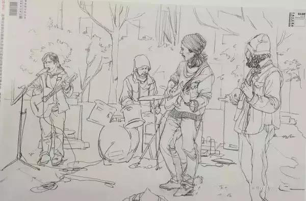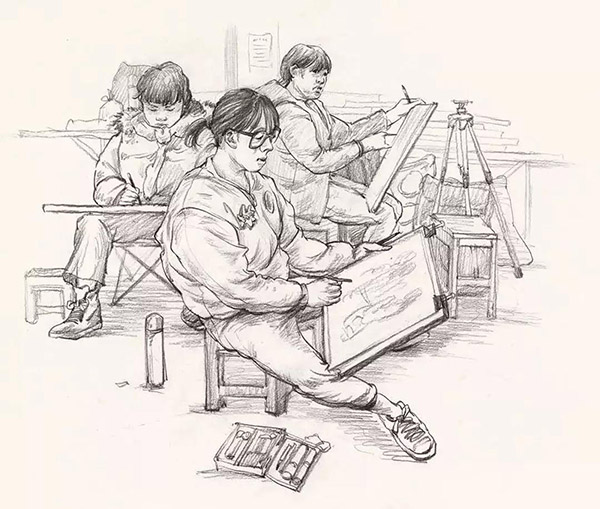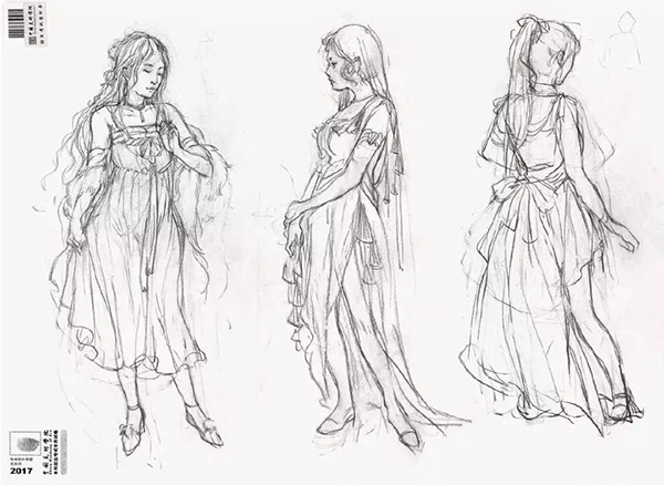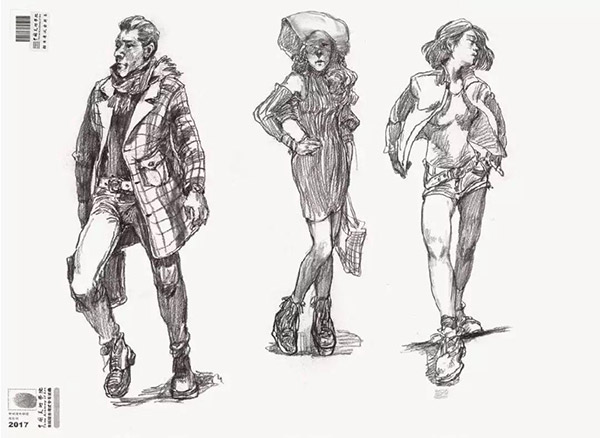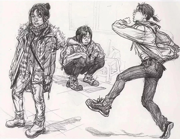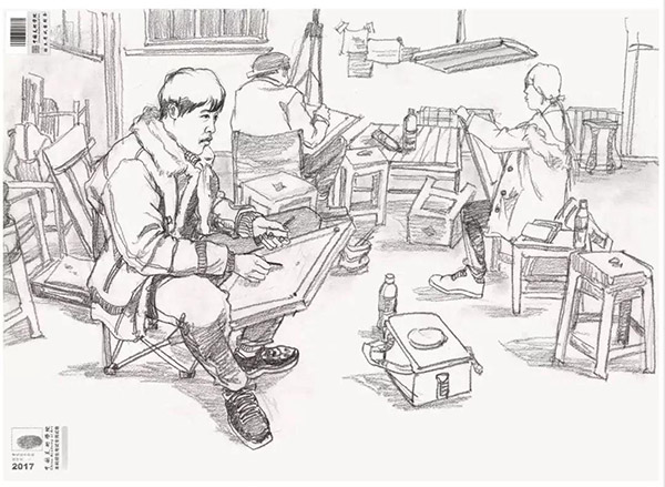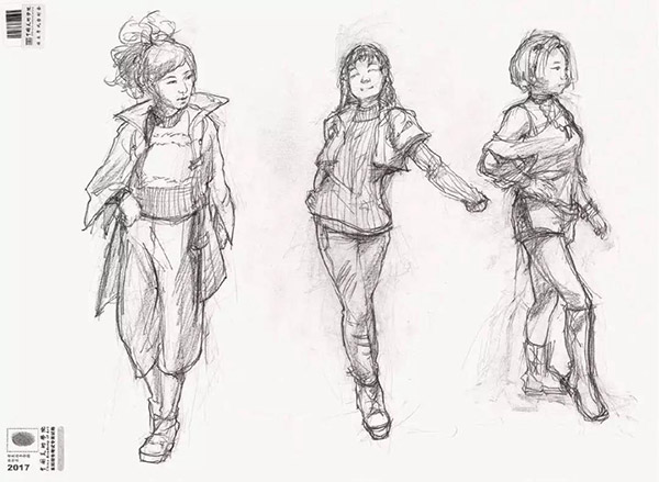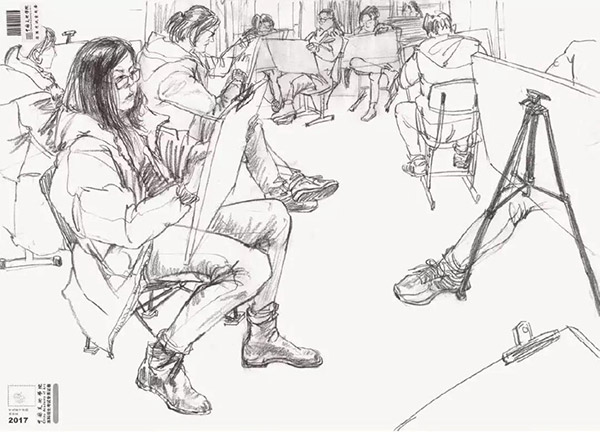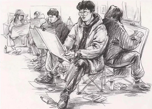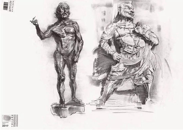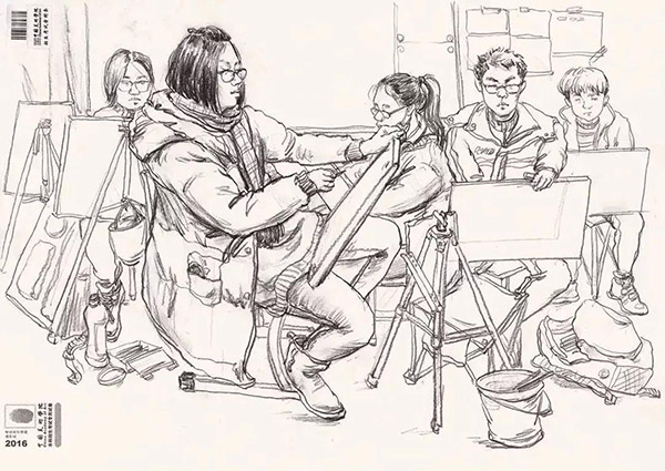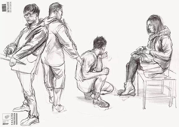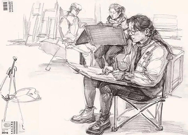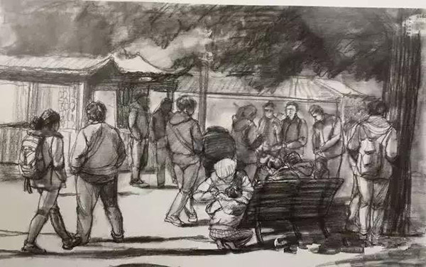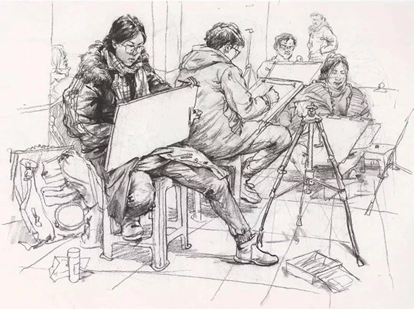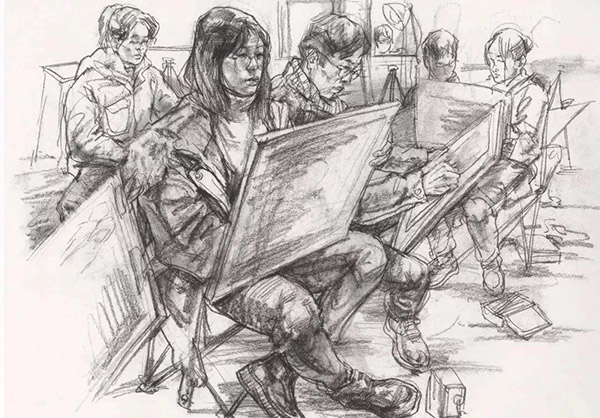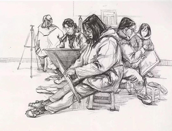 速写考题:考生互画三人场景,由三个人物组成,一个造型完整,另外两个自行安排