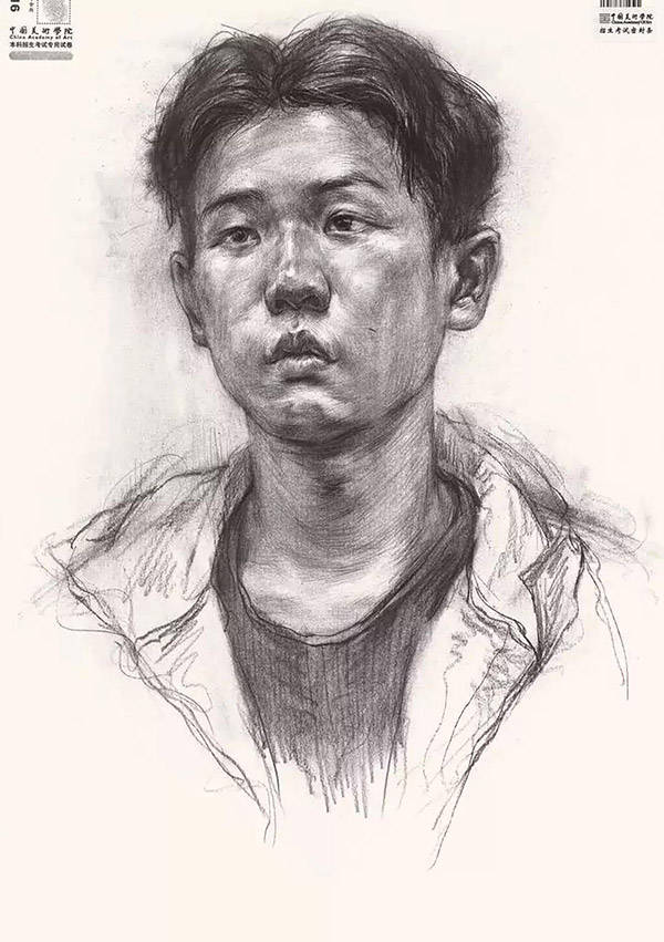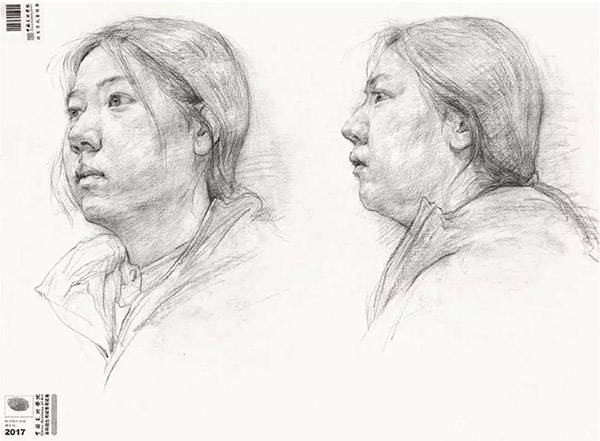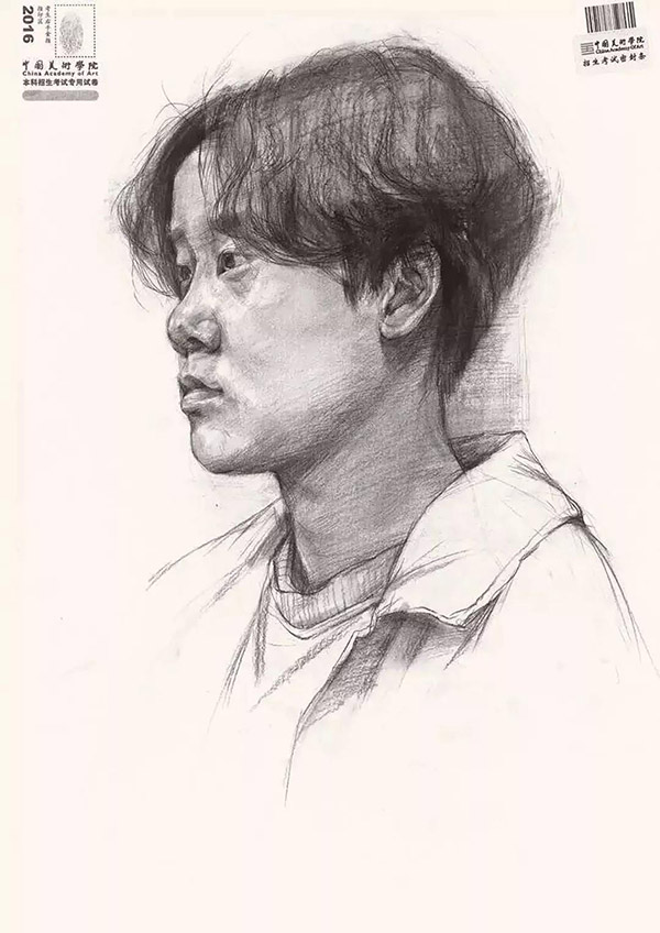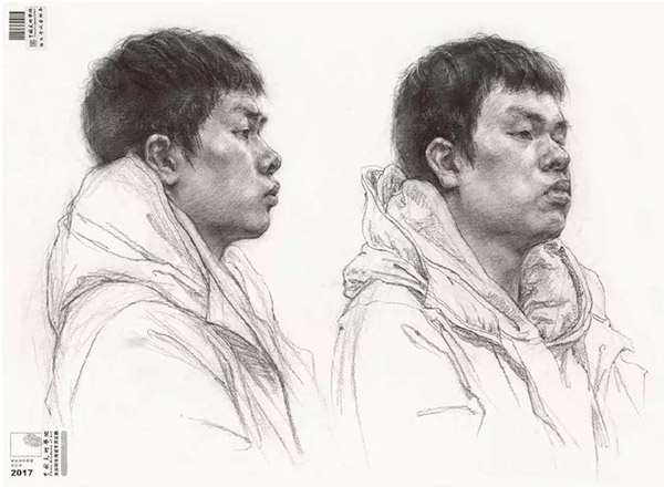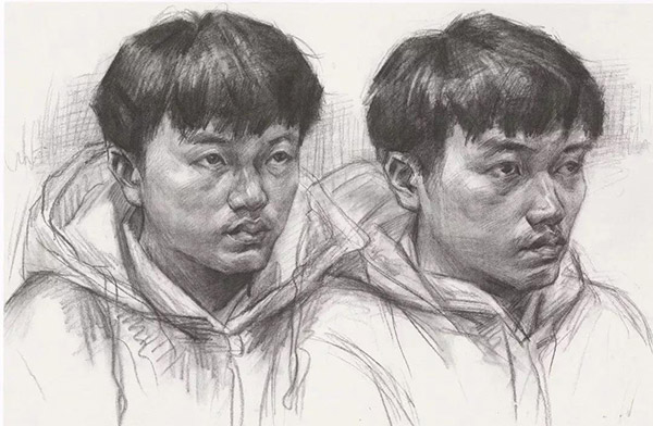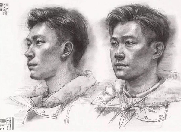 素描考题:默写,同一个男青年头像画两个不同的角度