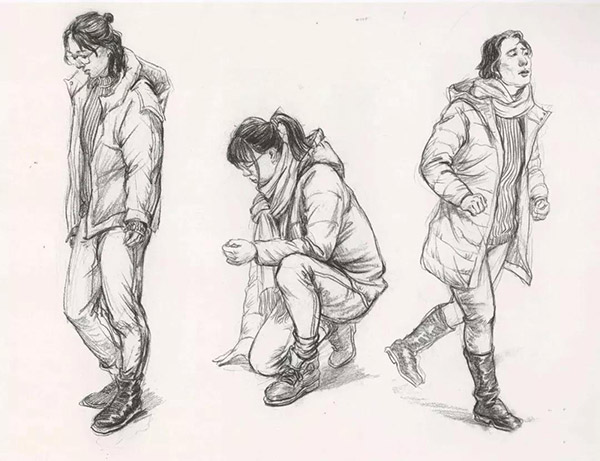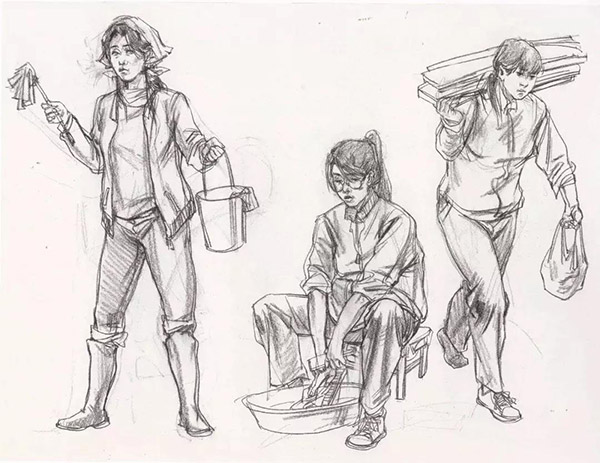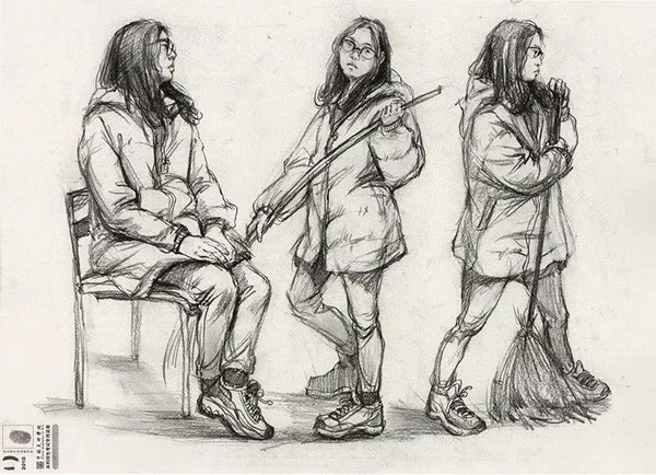 速写考题:四种人物动态默写,完成四个规定动作的默写:1、坐姿读书人物,2、站姿写生人物,3、拖地动态人物,4、蹲姿休息人物