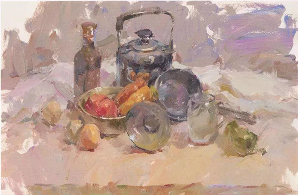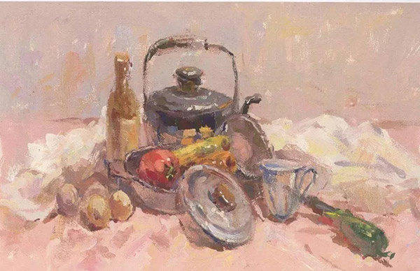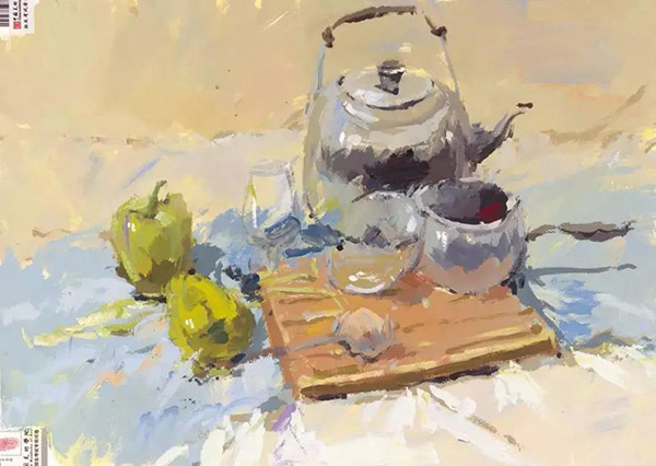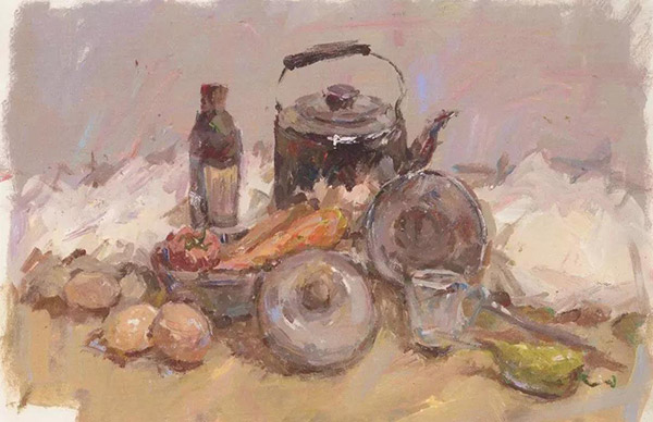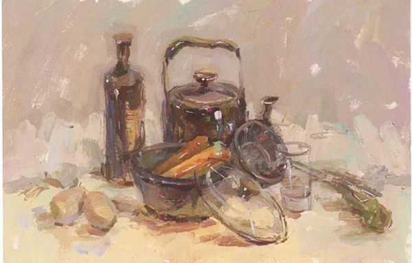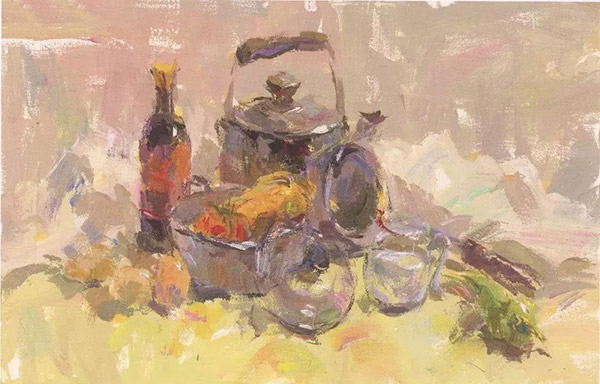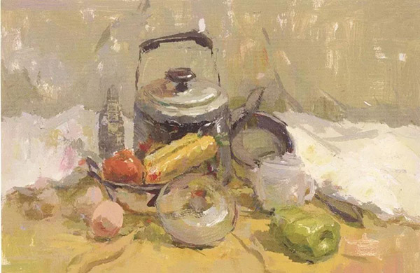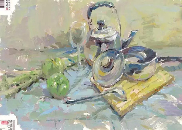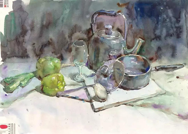 色彩考题:不锈钢水壶、单柄和双柄不锈钢锅、锅盖、胡萝卜、番茄、鸡蛋、玻璃杯、衬布、酒瓶等