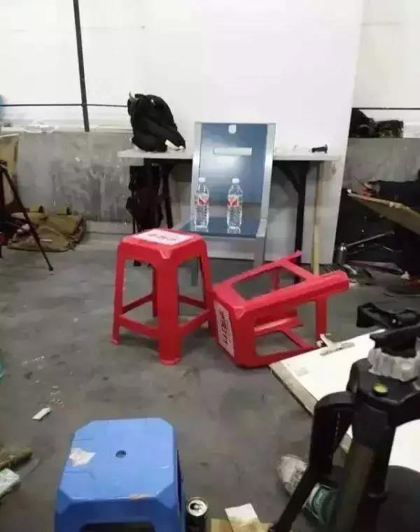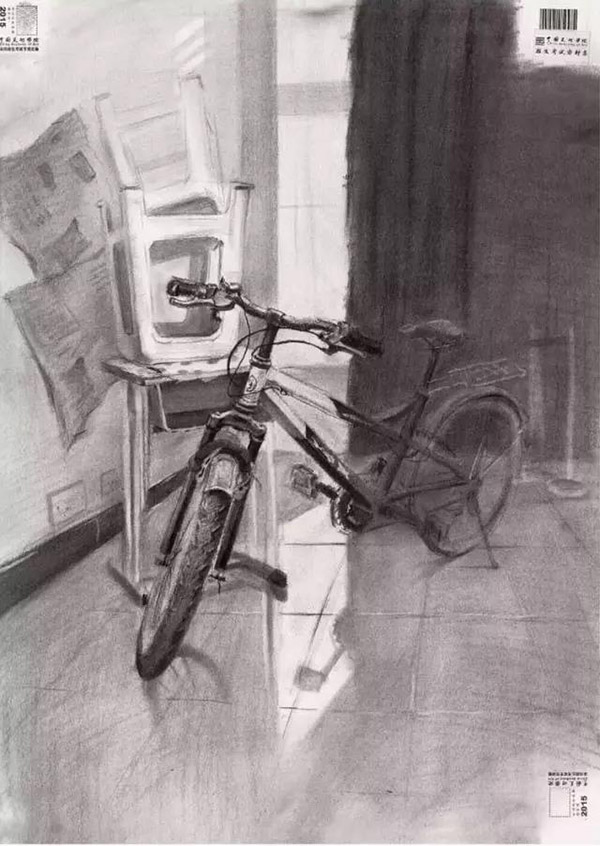 素描考题:一辆自行车,两个塑料凳子,倒着叠放在桌子上,背后的墙上还贴着两张报纸