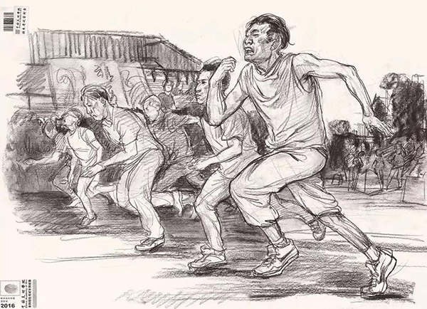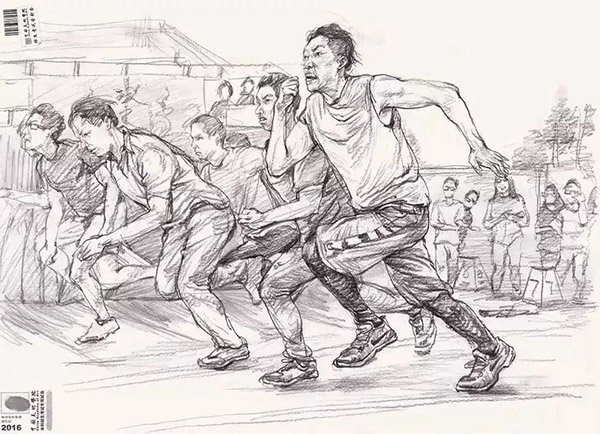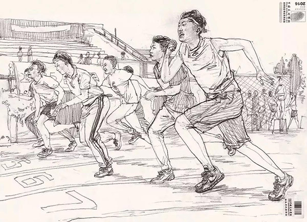 速写考题:以线性为主,国美运动会跑步的男生,后面是主席台和足球球门,边上有女学生在看