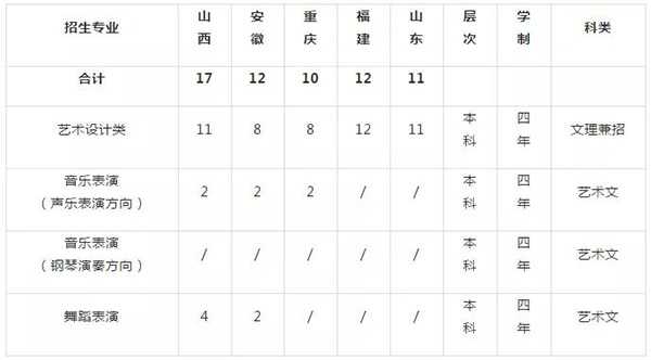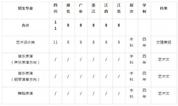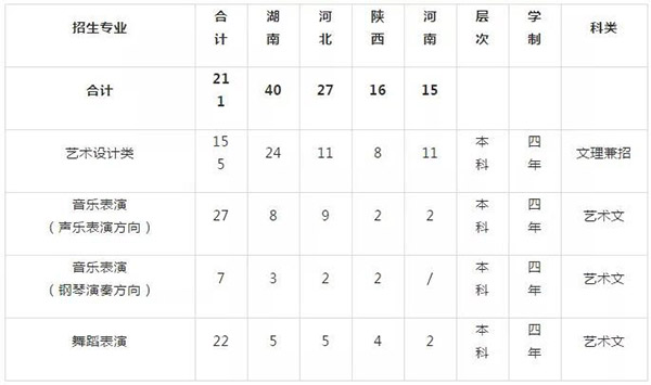 音乐舞蹈类(含音乐表演专业和舞蹈表演专业)招生计划总数为56名,只招文科。根据各省统考或校级联考成绩招生,按照专业招生、专业培养,学生进校后不能转换专业。
