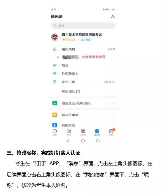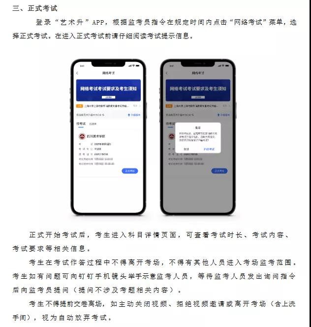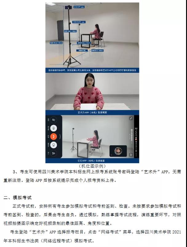 四川美术学院2021年书法类招生初试(网络远程考试)采用“阿里钉钉(DingTalk)”和“艺术升”APP双平台双机位模式完成。“阿里钉钉”(DingTalk)平台进行网络远程实时视频监考。同时,网络远程考试使用“艺术升”APP录制考试全程视频和拍摄试卷照片上传。