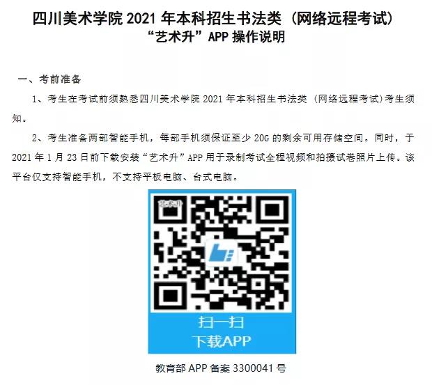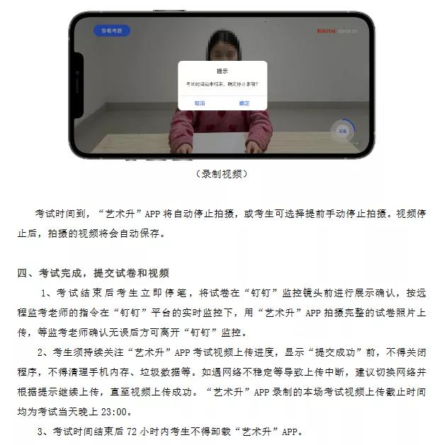 2、请考生用另一部智能手机提前安装“艺术升”APP,此平台仅支持智能手机,不支持平板电脑、台式电脑。安装“艺术升”APP的手机须保证在考试开始时至少20G的剩余可用存储空间,以保证在考试过程中不会发生因为手机存储空间不足导致录制中断、录制内容丢失的情况。具体操作请详阅附件2:《艺术升APP网络考试操作说明》。