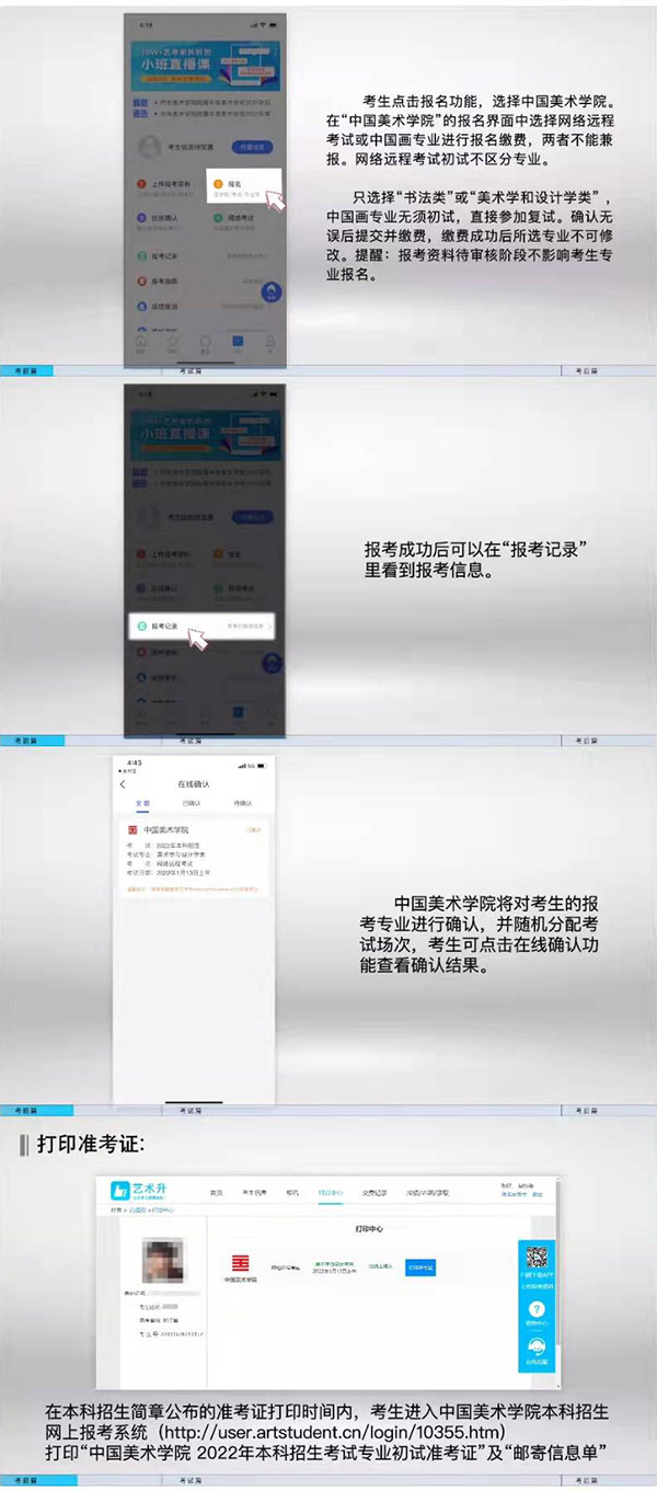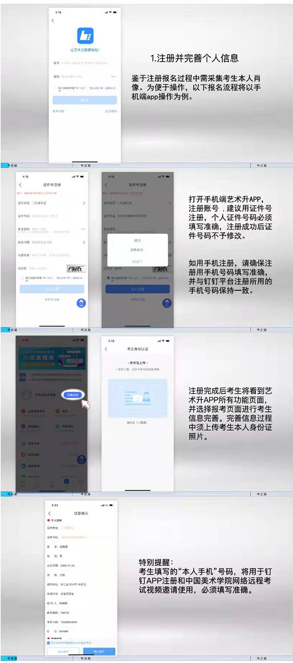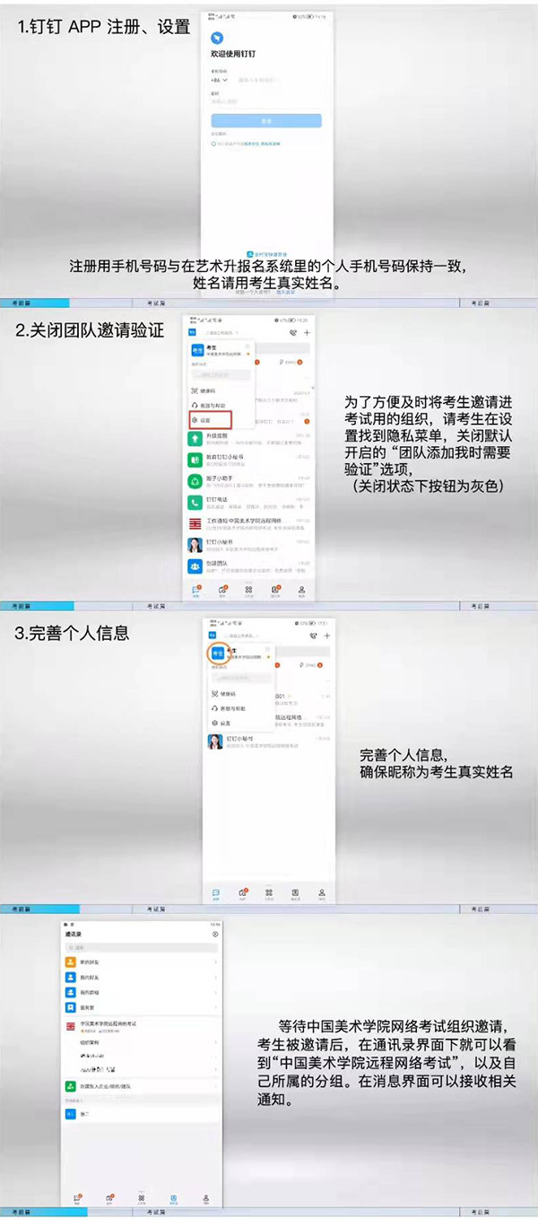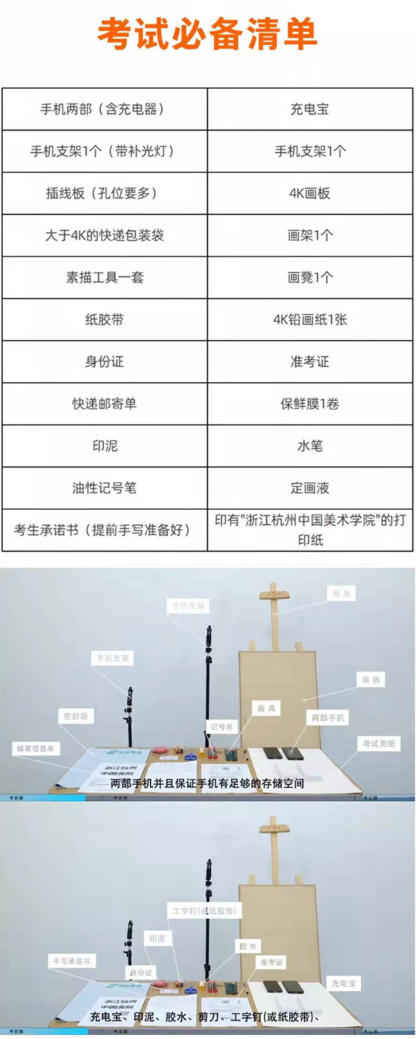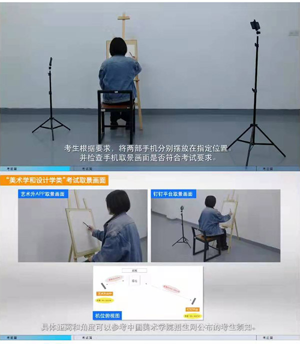 中国美术学院此次线上初试采用的是“钉钉”和“艺术升"两个APP。分别使用两部手机登录这两个APP,进行监考与录制。考生应当提前下载,熟悉软件,避免考试操作失误影响考试。