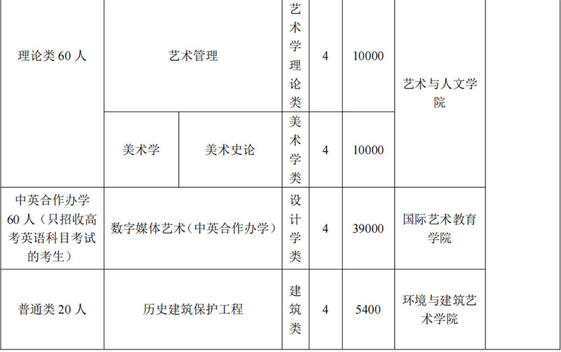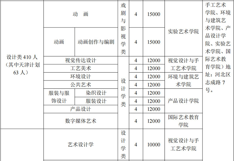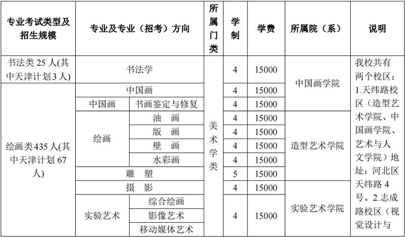 书法类25人(其中天津计划3人),绘画类435人(其中天津计划67人),设计类410人(其中天津计划63人),理论类60人,中英合作办学60人(只招收高考英语科目考试的考生),普通类20人。