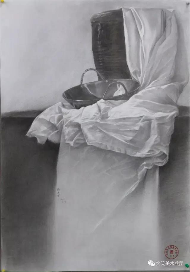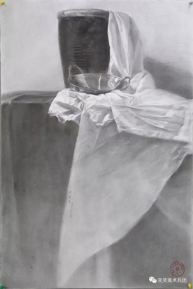 一般境况下在作画前需要先确定静物在纸上的主体物安排,这主要体现在造型上,首先要安排较大的器物,这也成为画面是否成功的一个重要因素。