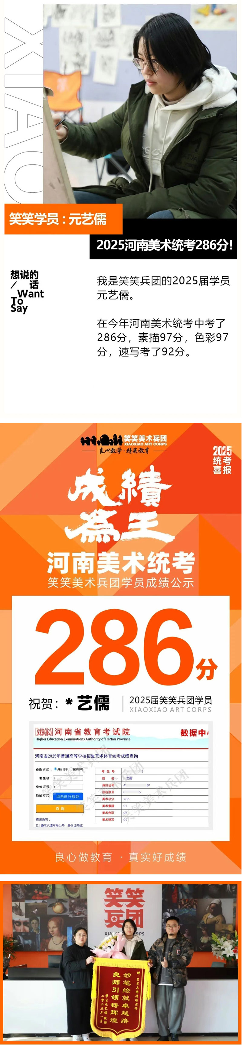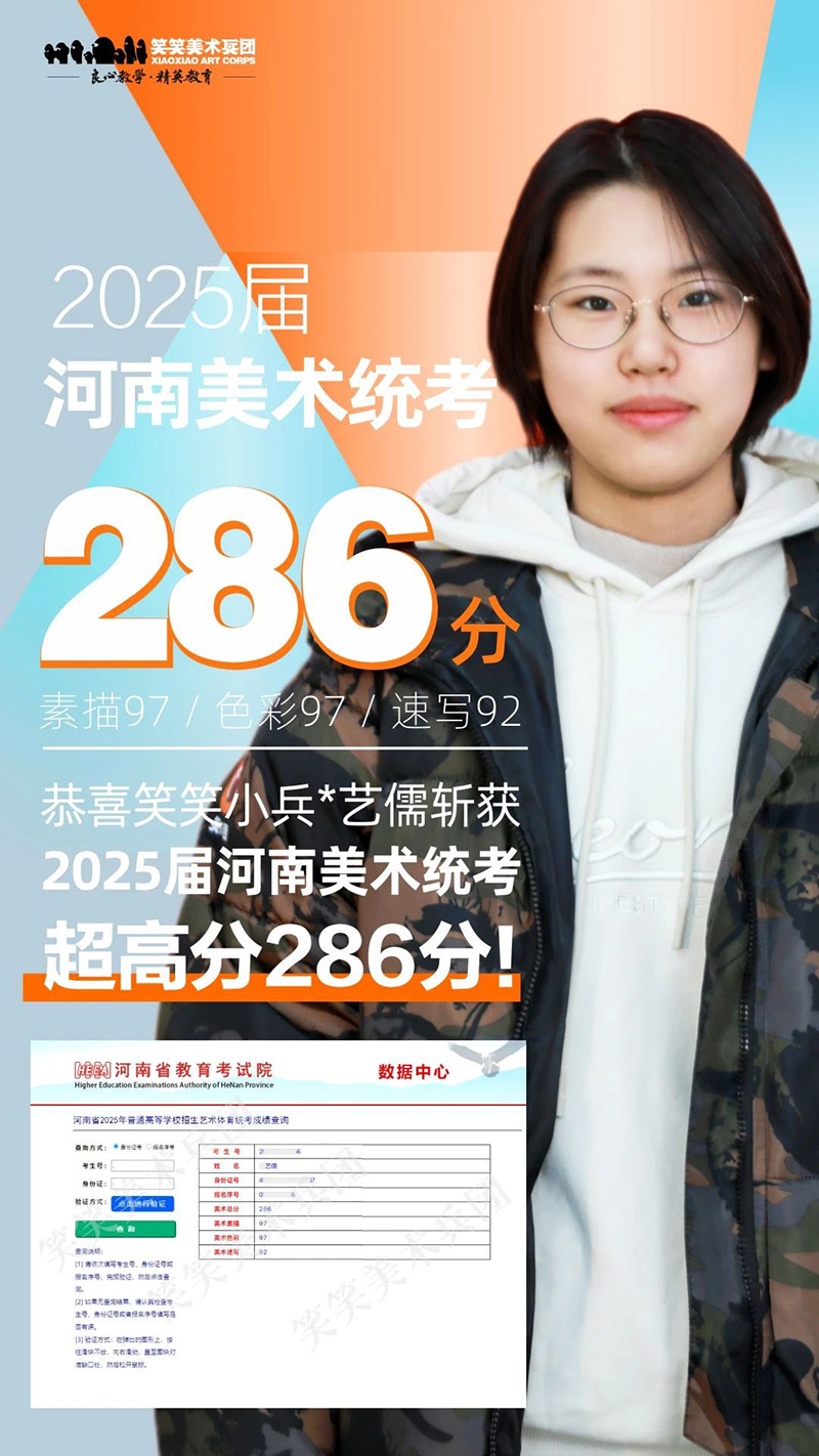 恭喜笑笑画室2025届元艺儒同学斩获河南统考超高分286分!