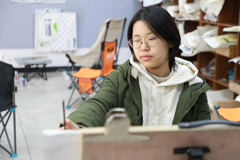 班里头也有很多色彩画得不错的同学,她也会非常积极的去向同学请教。我记得特别清楚,到了考前一周,那段时间她是比较焦虑的,甚至出现了画面过犹不及的问题。有几张色彩,我甚至觉得还没有前段的时候画面清晰,主要还是心态乱了。那个时候压力确实相对比较大,但是后来孩子也是能坚持下来。