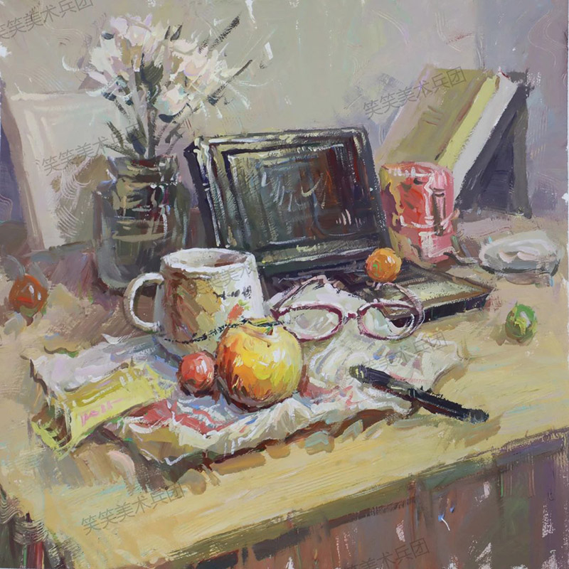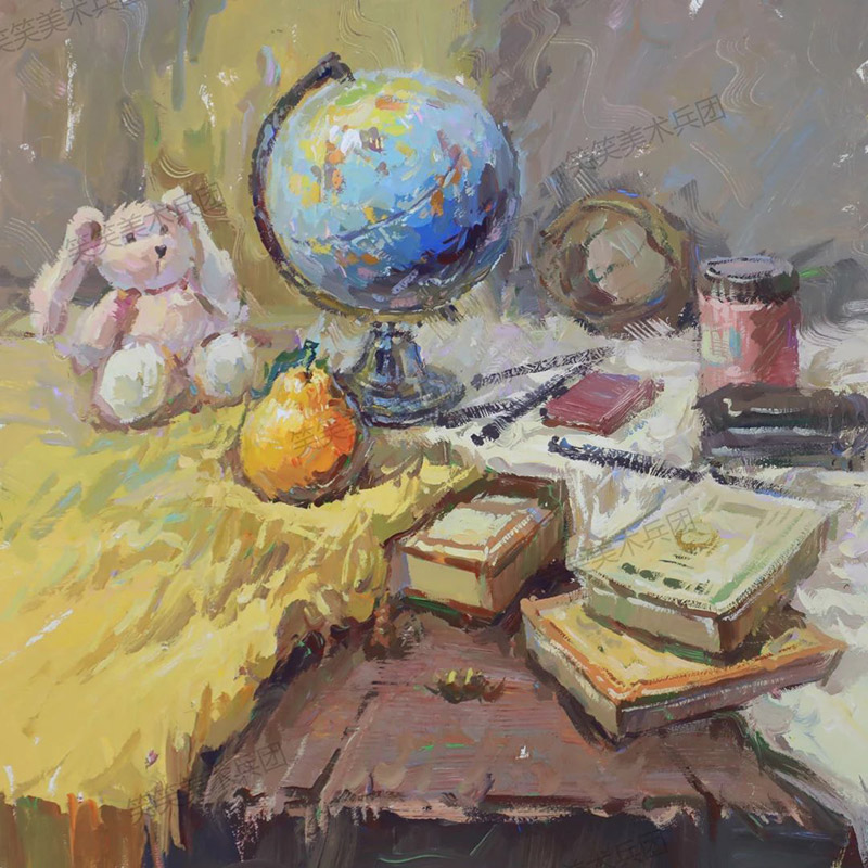 马菁雨的色彩画面,其实一直表现是非常稳定的。每一张画她都能够很稳定的去完成每一步的塑造内容,并保持色彩关系。她的色彩关系整体上还是相对比较协调的,不是那种特别鲜艳的画面。她对色彩静物的题材,其实没有特别的局限,不论出什么样的题型,都把物体表达清晰。这也要特别感谢素描老师能把她的素描静物的基础打得比较牢,所以换色彩静物会比较轻松。