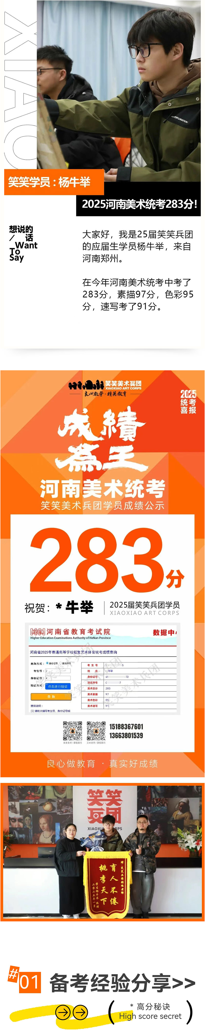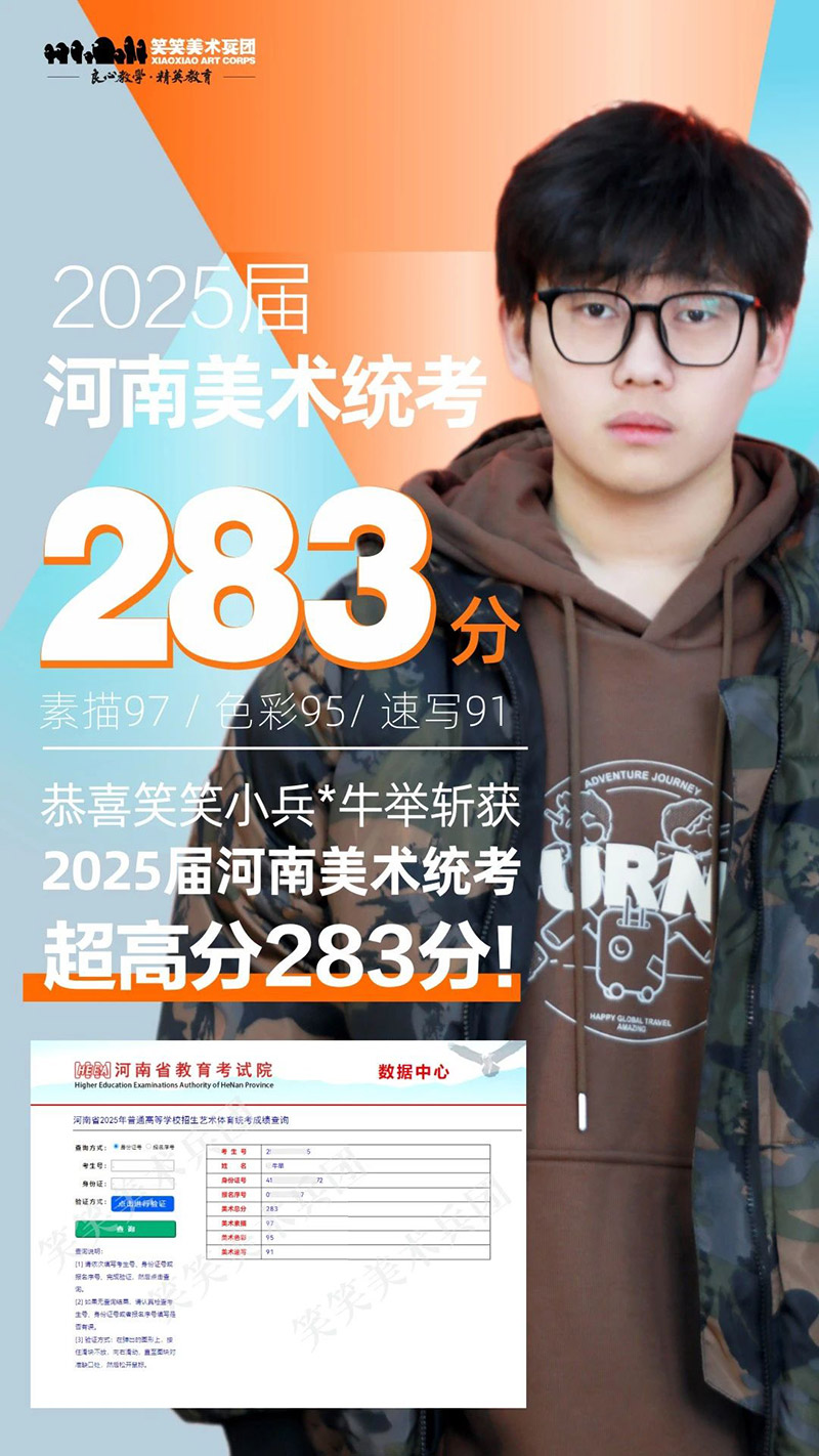 恭喜笑笑画室2025届杨牛举同学斩获河南统考超高分283分!
